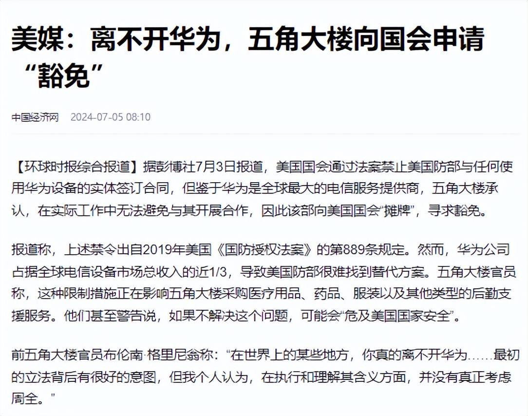 根據《環球時報》消息:2024年7月2日,美國五角大樓在接受國會質詢期間表示,由於華爲是目前全球最大的電信設備及服務提供商,因此在實際工作中,根本不可能避開和華爲的合作。有鑑於此,五角大樓向國會申請豁免,建議恢復與華爲的合作。