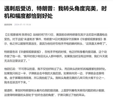 《遇刺後受訪,特朗普:我轉頭角度完美,時機和幅度都恰到好處》—觀察者網