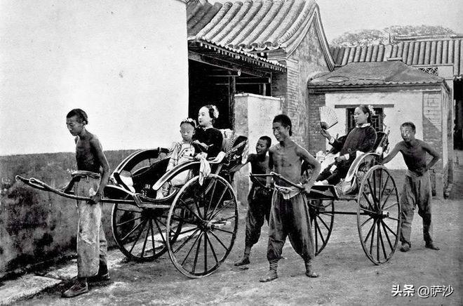 當乘客坐穩了以後,僕人們會將車轅抬起來行走,此時翠幄青紬車就類似於兩輪黃包車。