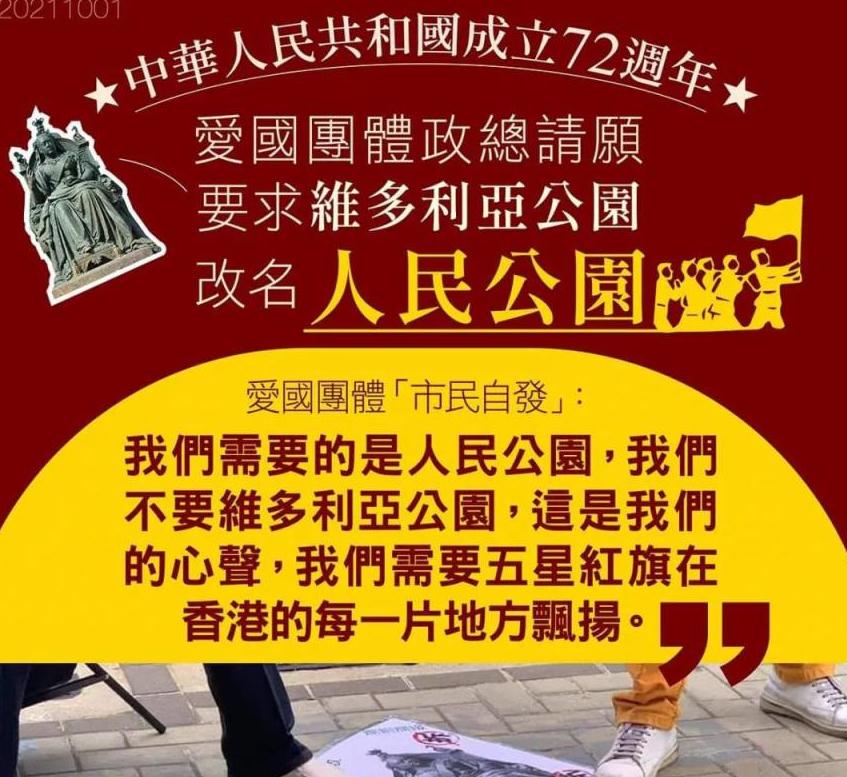 2021年國慶節,在香港上飄揚着五星紅旗,多個愛國團體更是自發向香港政府請願,希望可以將香港地標之一的“維多利亞公園”改名爲“人民公園。”該消息一出,引起不少網友熱議,也將人們的視線放到了香港“去殖民化”這一目標當中。