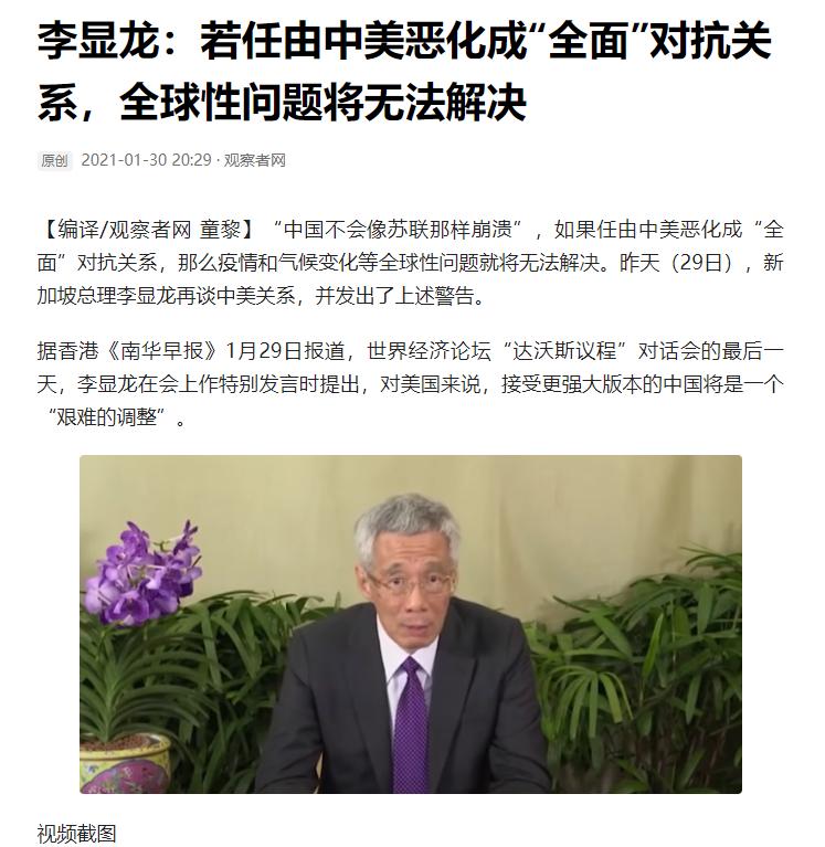 李顯龍:若任由中美惡化成“全面”對抗關係,全球性問題將無法解決 觀察者網 2021-01-30