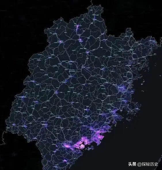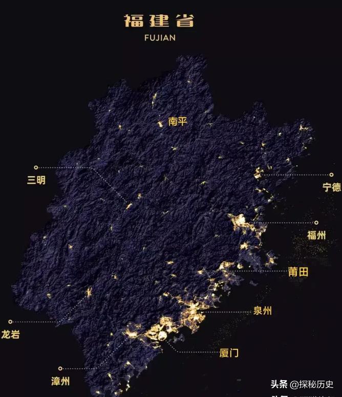與此同時,福建省的東部沿海地帶同樣燈光耀眼,尤其是福州、廈門、泉州、漳州等地,夜晚的城市燈火通明,顯示出強大的經濟活力。相反,福建西部山區的燈火則顯得十分稀疏,寧靜與黑暗籠罩着廣袤的山地。