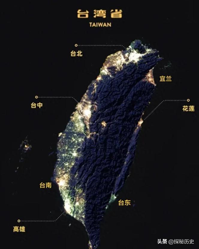 而與之形成鮮明對比的是臺灣東部的黑暗,那裏的山脈和海岸線上,只能看到宜蘭、花蓮和臺東少數地區的零星燈光。
