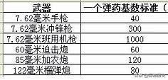 比如步槍彈的一個基數是80發,手槍彈24發,衝鋒槍彈140發,輕機槍800發,重機槍1600發,還有一些大炮的基數,比如60毫米迫擊炮一個基數是30發,重迫擊炮一個基數則是40發。