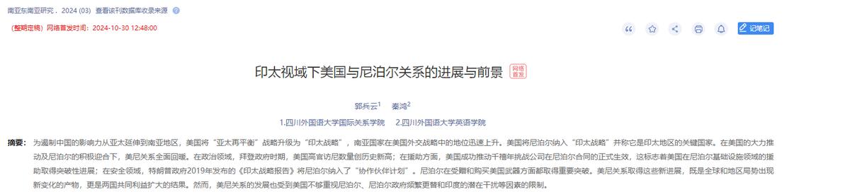 印太視域下美國與尼泊爾關係的進展與前景 郭兵雲、秦鴻 南亞東南亞研究