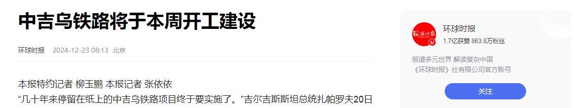 2024年12月20日,中吉烏鐵路在吉爾吉斯斯坦總統府舉辦投資簽字儀式,標誌着這條早在1997年就被寫入三國政府備忘錄的鐵路項目終於開始落實。