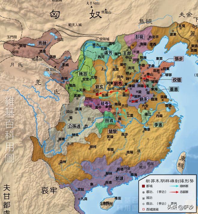 敵人還剩下這幾個,北方的彭寵盤踞河北一部分地區,勾結匈奴試圖自保;張步盤踞今天山東一部分地區;劉永盤踞河南一部分地區;董憲盤踞江蘇一部分地區;李憲盤踞安徽一部分地區;盤踞陝西省山西省一部的盧芳;盤踞甘肅省的隗囂和竇融;盤踞四川的公孫述。