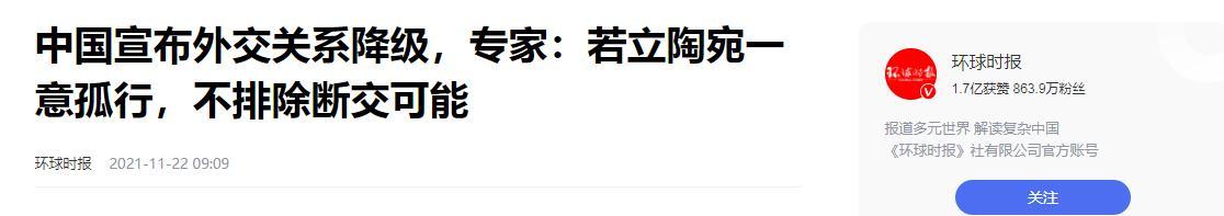 中國宣佈外交關係降級,專家:若立陶宛一意孤行,不排除斷交可能 環球時報