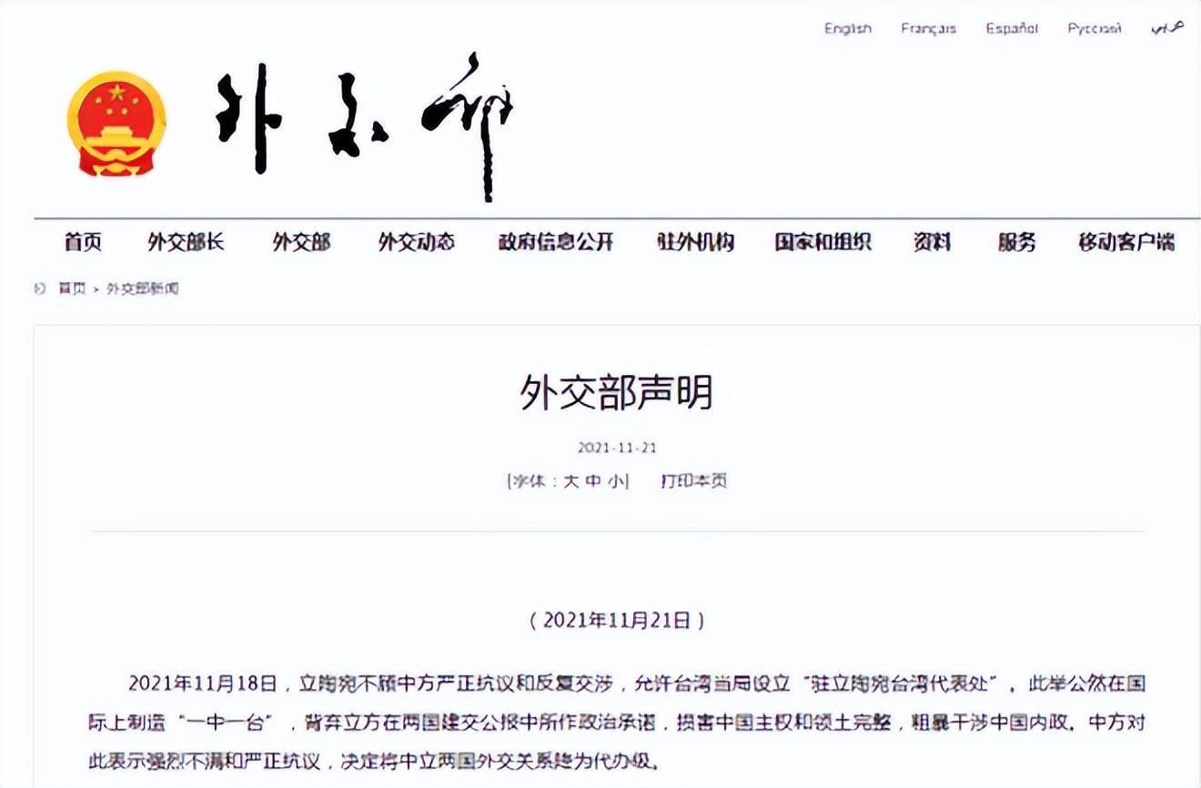 在立陶宛政府批准“臺灣代表處”2天后,中國乾脆將兩國關係一降到底,直接降到了代辦級,距離斷交只有最後一步。