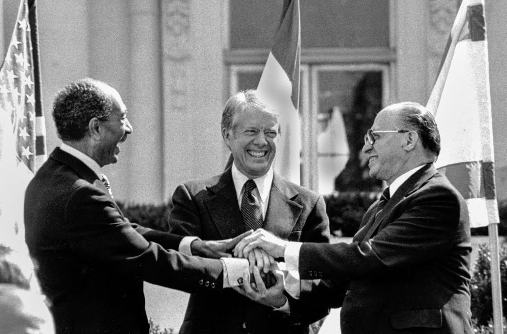 次年,他又在美國總統專屬休假地戴維營,同時邀請了埃及總統薩達特與以色列總理貝京,通過斡旋使兩國結束了自第一次中東戰爭以來的敵對狀態
