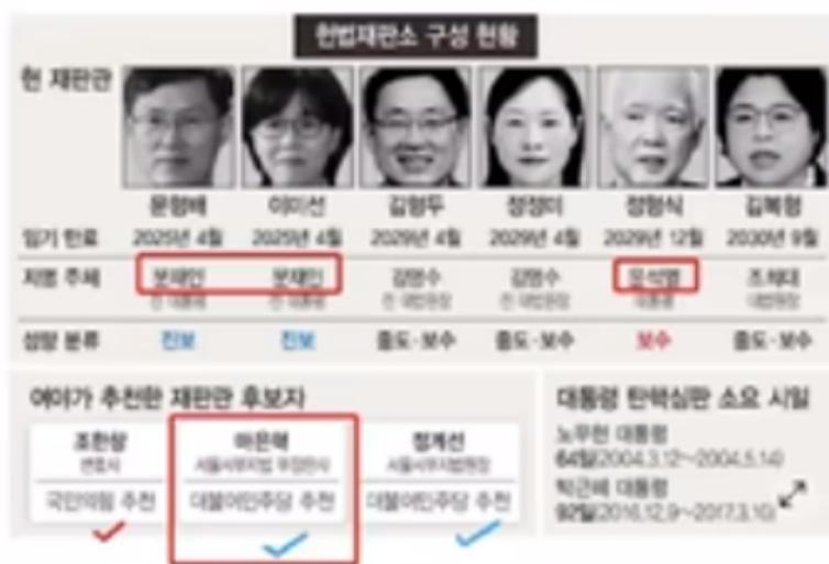 但要尹錫悅正式下臺,還需要憲法法院認可彈劾案,但當時的在職大法官數量不滿足開庭需求,於是執政黨與反對黨圍繞大法官的問題又展開了一輪接一輪的鬥法。
