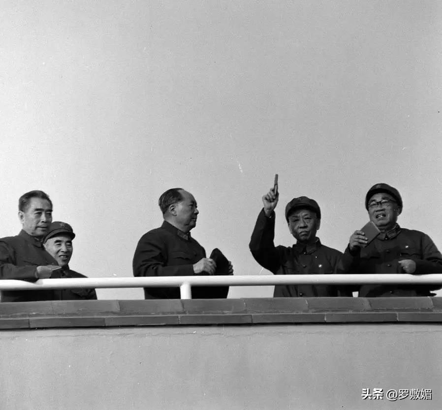 這一年,朱德年事已高,戴着老花鏡,仍然陪同毛主席登上天安門城樓,並且手持《毛主席語錄》向遠方揮舞。