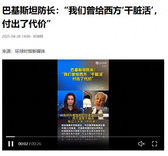 巴基斯坦防長:我們曾給西方“幹髒活”,爲此付出了代價,環球時報,2025-04-27