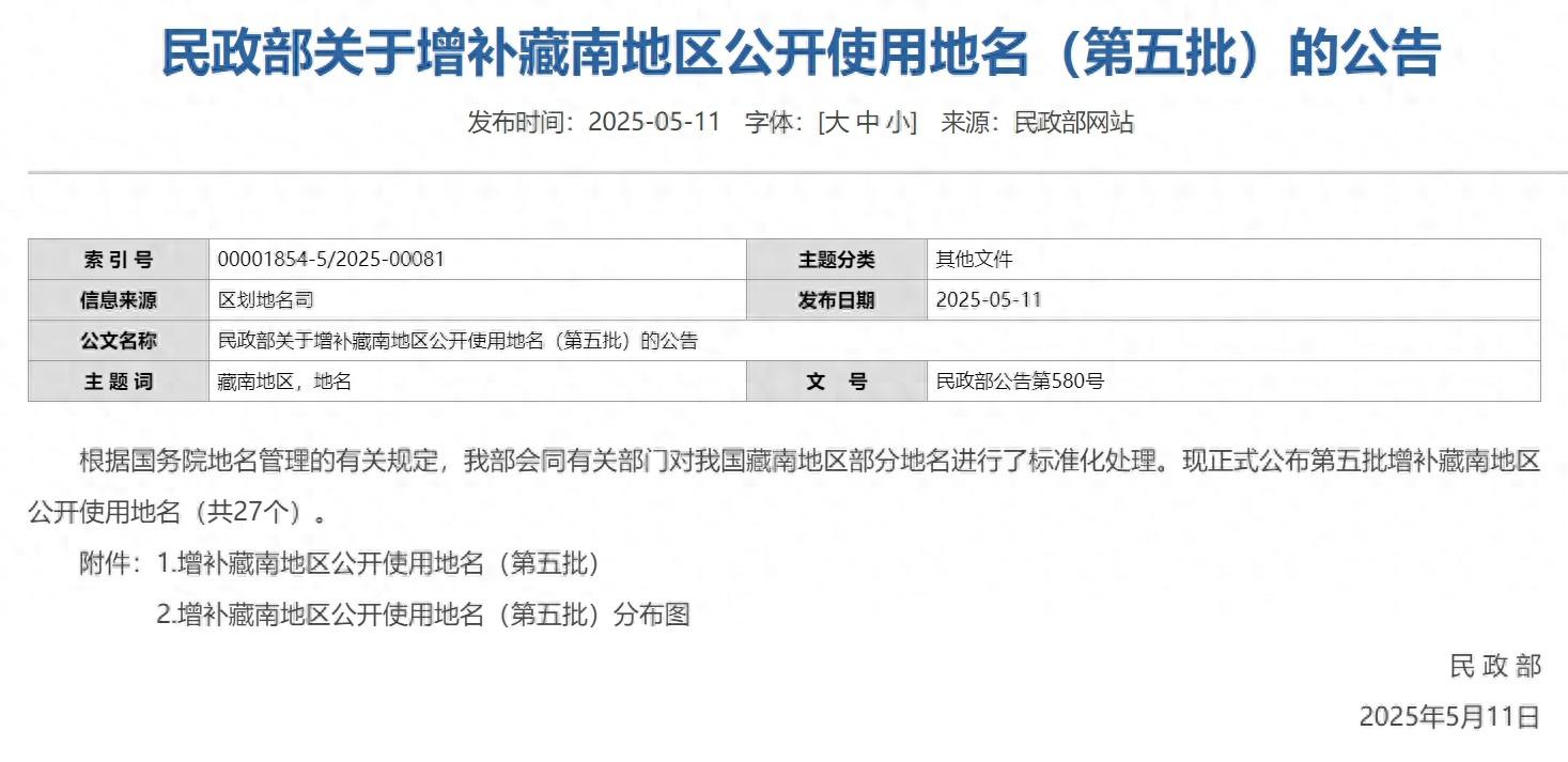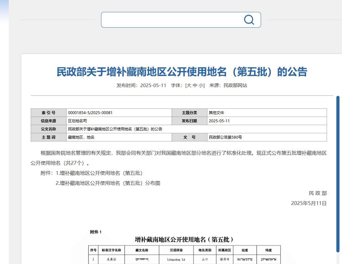 2025年5月11日上午10點,中國民政部正式發佈“第五批藏南地區公開使用地名”,共計27個。