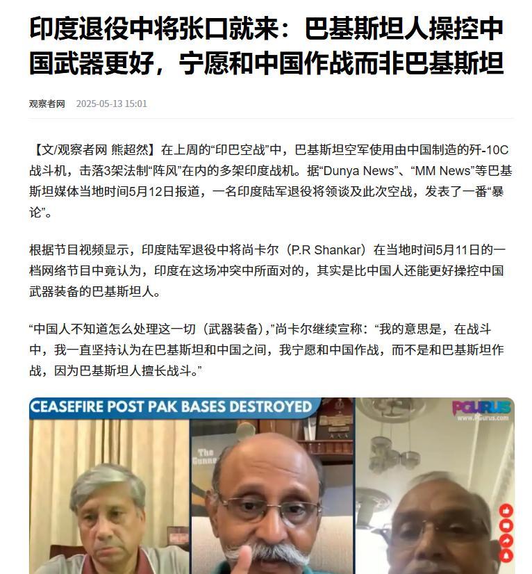 印度退役中將張口就來:巴基斯坦人操控中國武器更好,寧願和中國作戰而非巴基斯坦,觀察者網,2025-05-13