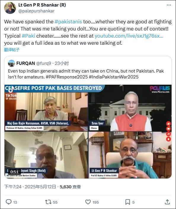 2025年5月11日,印巴剛剛宣佈達成停火協議不到48小時,印度陸軍退役中將尚卡爾在一檔網絡節目上,針對此次印巴衝突,大放厥詞。