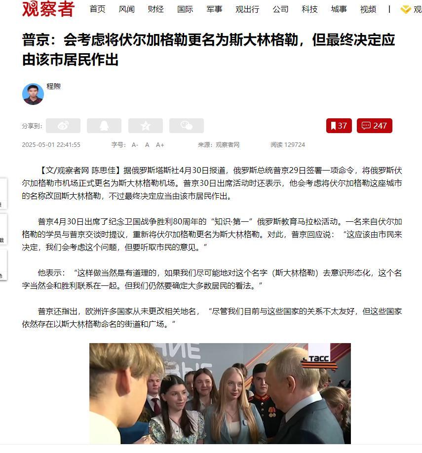 普京:會考慮將伏爾加格勒更名爲斯大林格勒,但最終決定應由該市居民作出,觀察者網,2025-05-01