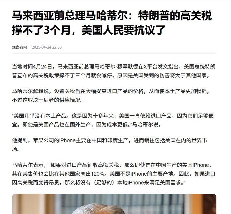 馬來西亞前總理馬哈蒂爾:特朗普的高關稅撐不了3個月,美國人民要抗議了,觀察者網,2025-04-24