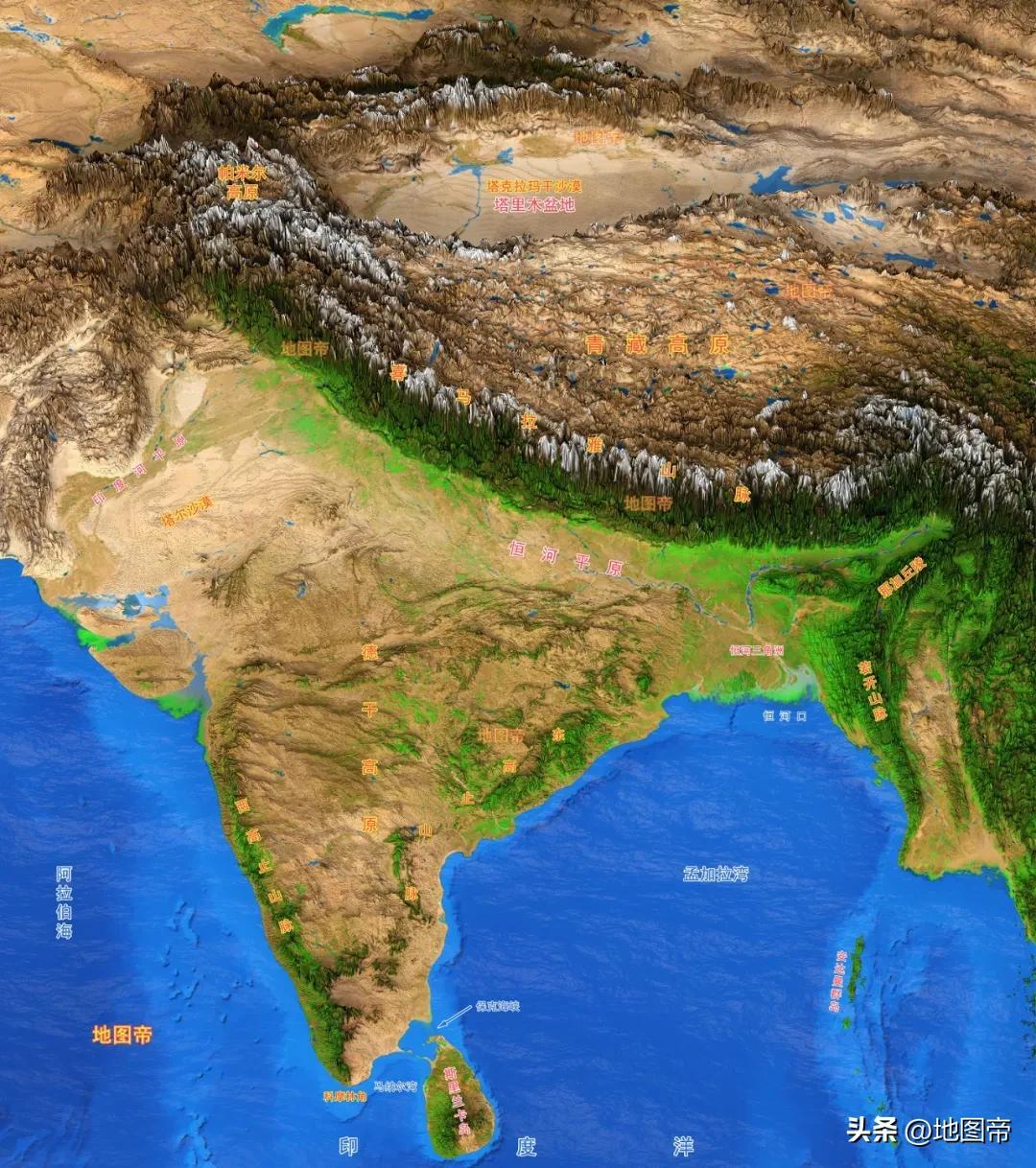 印度周邊地形按順時針方向依次爲:塔爾沙漠、喜馬拉雅山脈、那加丘陵、若開山脈。印度中間北部是恆河平原,中部和南部爲德干高原。