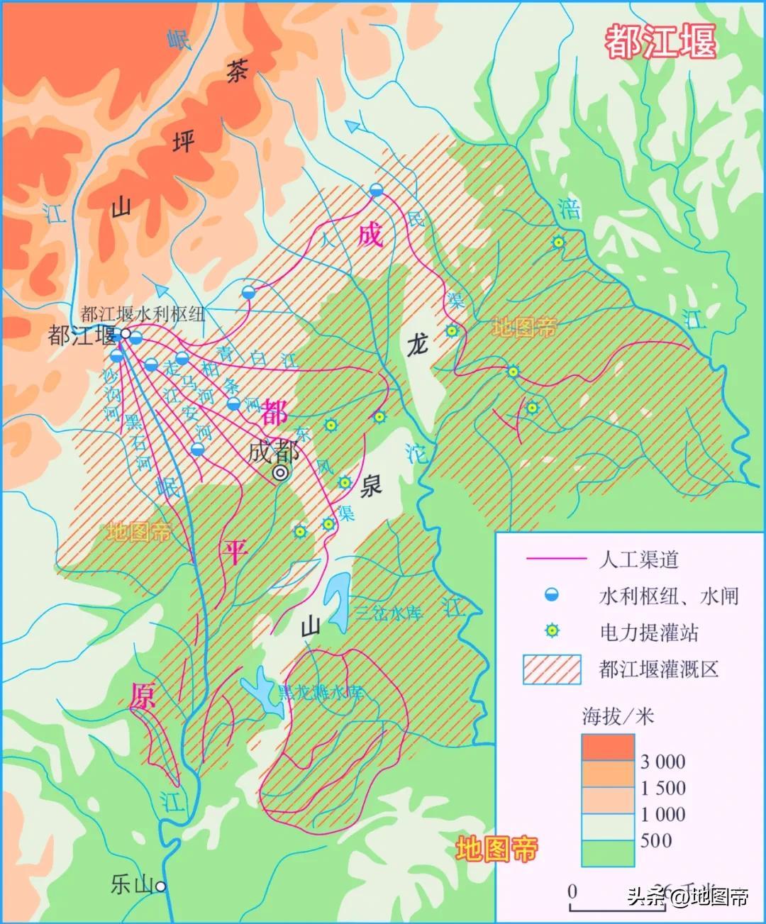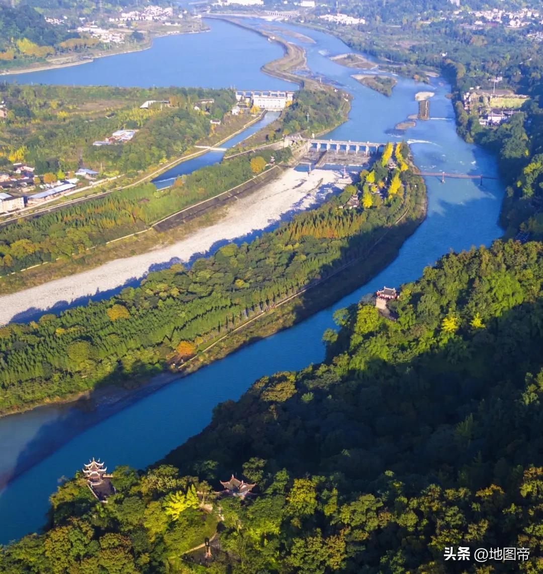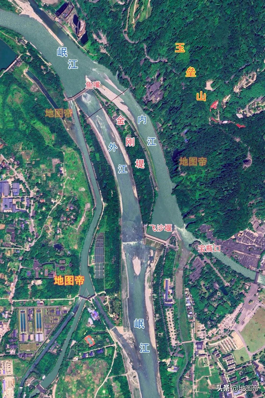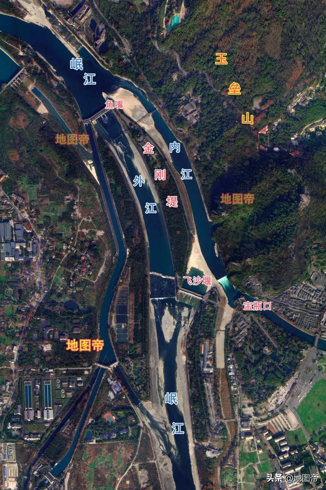 外江在西側,爲岷江正流,稱金馬河,流入成都溫江、崇州;內江在東側,通過引水閘,呈扇形進入市區,從北往南依次是蒲陽河、柏條河、走馬河、江安河,流入成都新都、郫都、溫江,匯入金堂的沱江和成都市區的府河。
