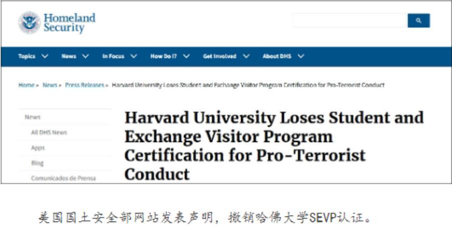 當天,美國國土安全部發出聲明,表示已經取消了哈佛大學的“學生和交流訪問學者項目”認證,這意味着哈佛不能繼續接收國際學生和交流學者。
