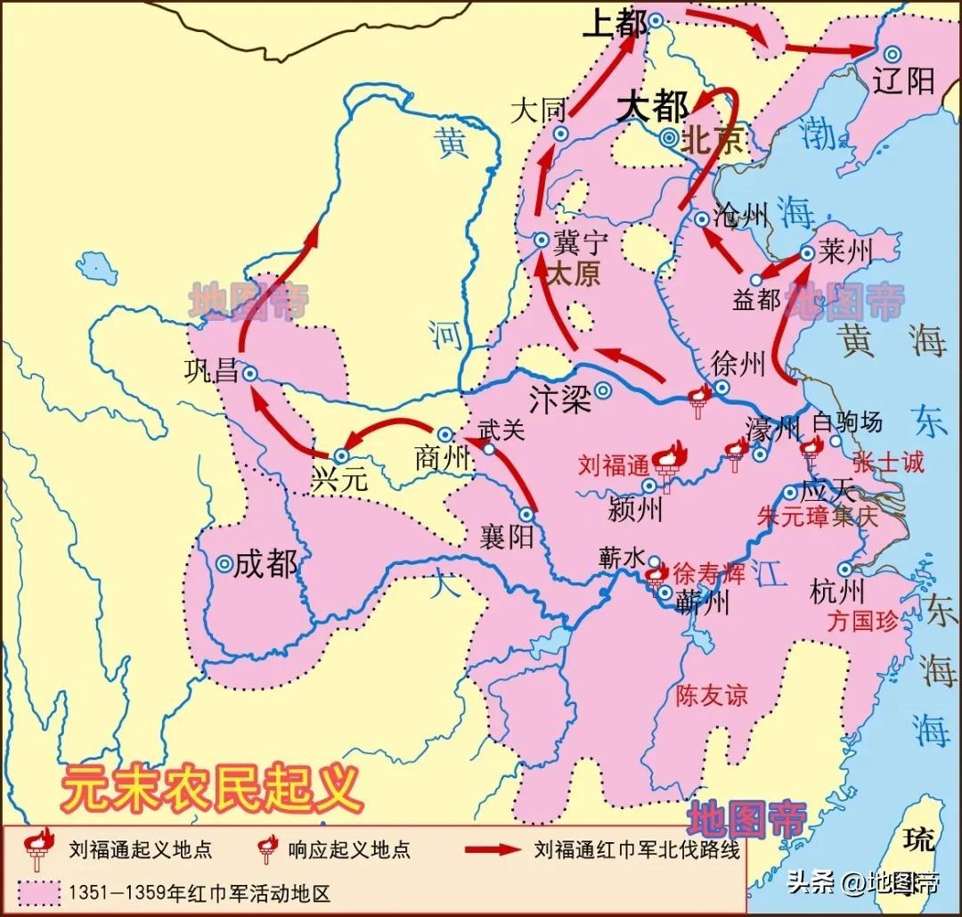 此時濠州的郭子興舉事,朱元璋在其帳下效力,所有人都沒想到,這個窮和尚,居然成了改寫歷史的巨人。以當時的形勢,郭子興、朱元璋計劃先取東南的南京,而不是軍事實力雄厚的大都(今北京),先定南方,再取天下。
