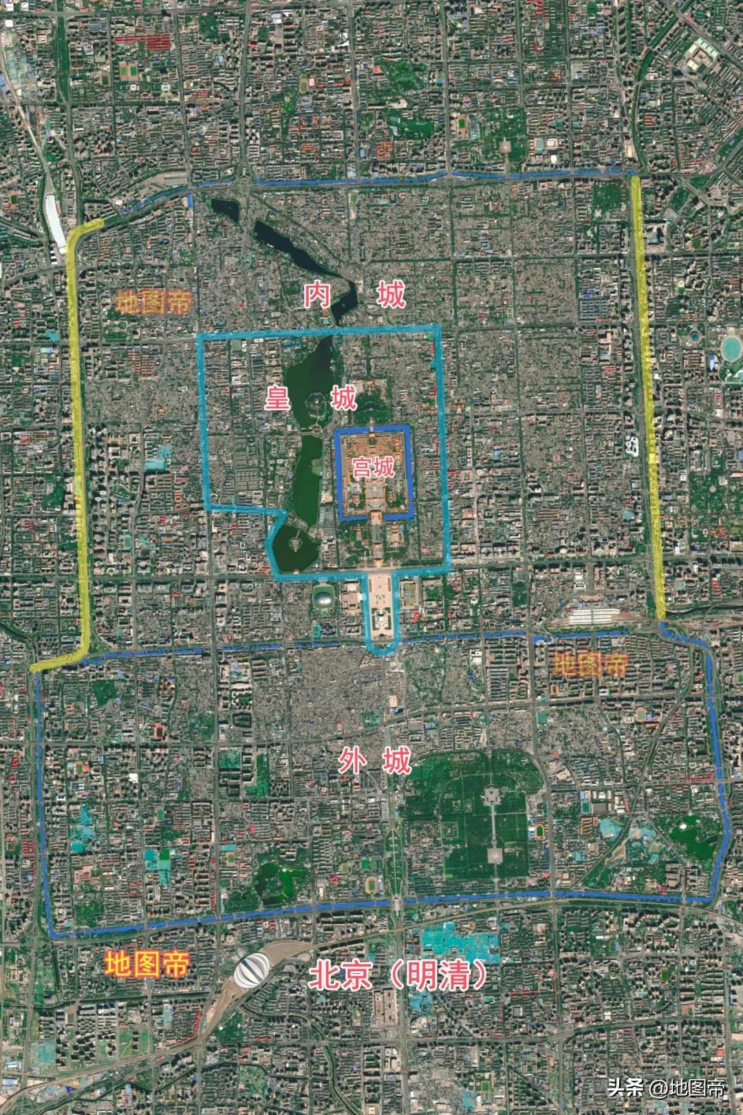 明清北京城呈“凸”字型,南邊是外城(國城),北邊是內城(京城),內外城面積合計59.43平方千米。內城裏面有皇城,皇城裏面有宮城(紫禁城)。