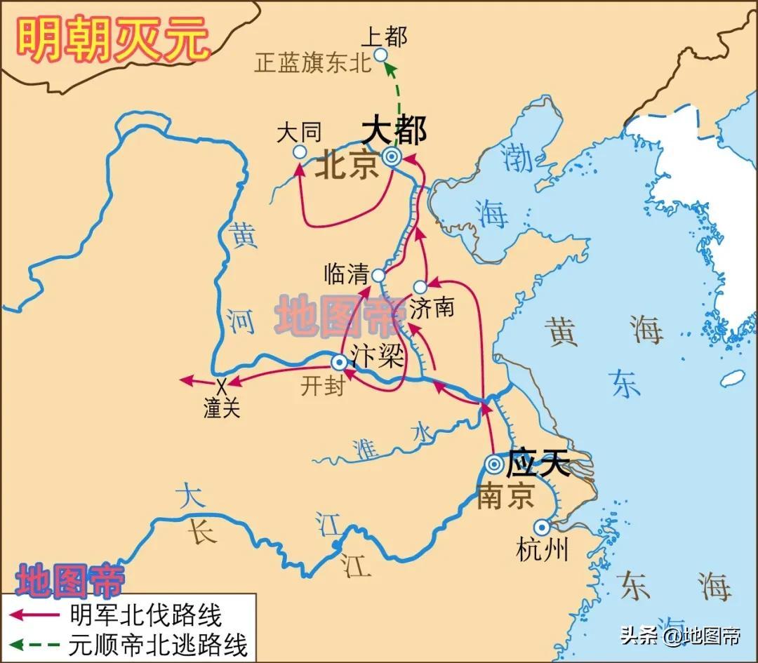 1367年(元順帝元至正二十七年、朱元璋吳元年),朱元璋拜徐達爲徵虜大將軍,常遇春爲副將軍,統兵二十五萬,渡淮河北上,北取中原。元朝已如朽木,腐爛至極,怎能抵擋明軍的摧枯拉朽?