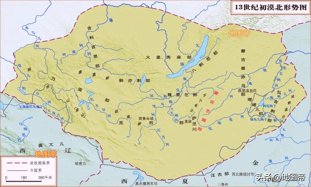 1206年(金章宗泰和六年,南宋寧宗開禧二年,西夏桓宗天慶十三年)春,大漠各部在斡難河(今鄂嫩河)源頭召開大會,蒙古的一代天驕鐵木真,統一大漠各部,稱成吉思汗,大致意思是“像大海或天一樣的偉大首領”,定國號爲“大蒙古國”。