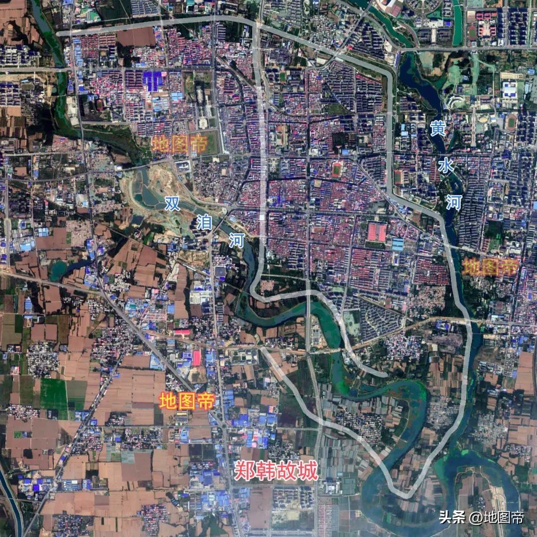 鄭韓故城在溱水(黃水河)和洧水(雙洎河)交匯處,呈牛角形,面積約16平方千米。鄭韓故城周長20多千米,合西周四十五里,古稱四十五里牛角城。
