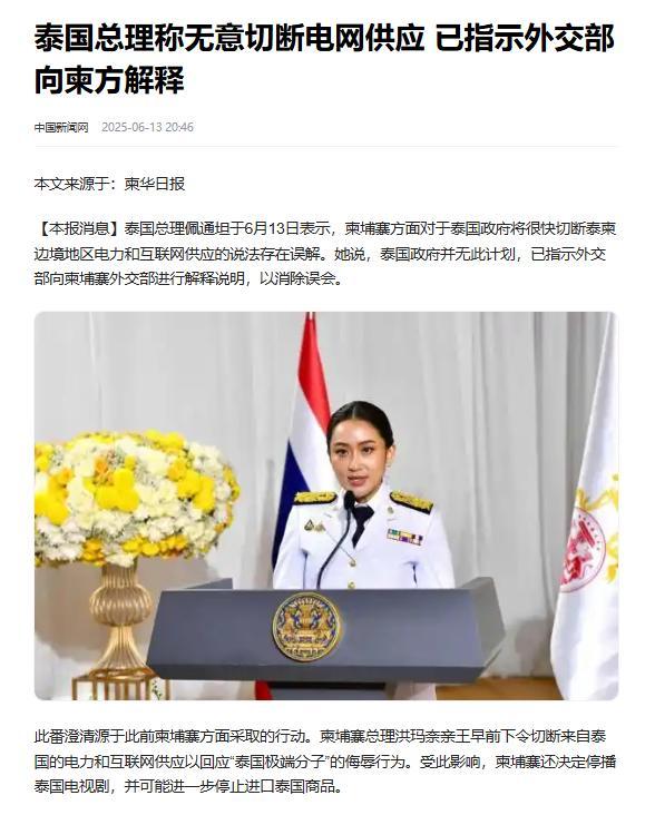 泰國總理稱無意切斷電網供應 已指示外交部向柬方解釋,中國新聞網,2025-06-13