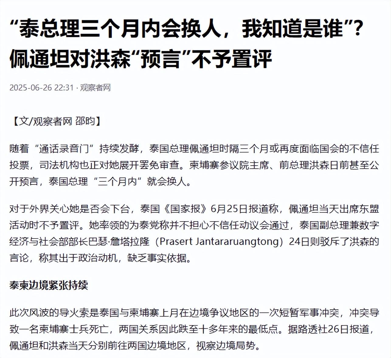 “泰總理三個月內會換人,我知道是誰”?佩通坦對洪森“預言”不予置評,觀察者網,2025-06-26