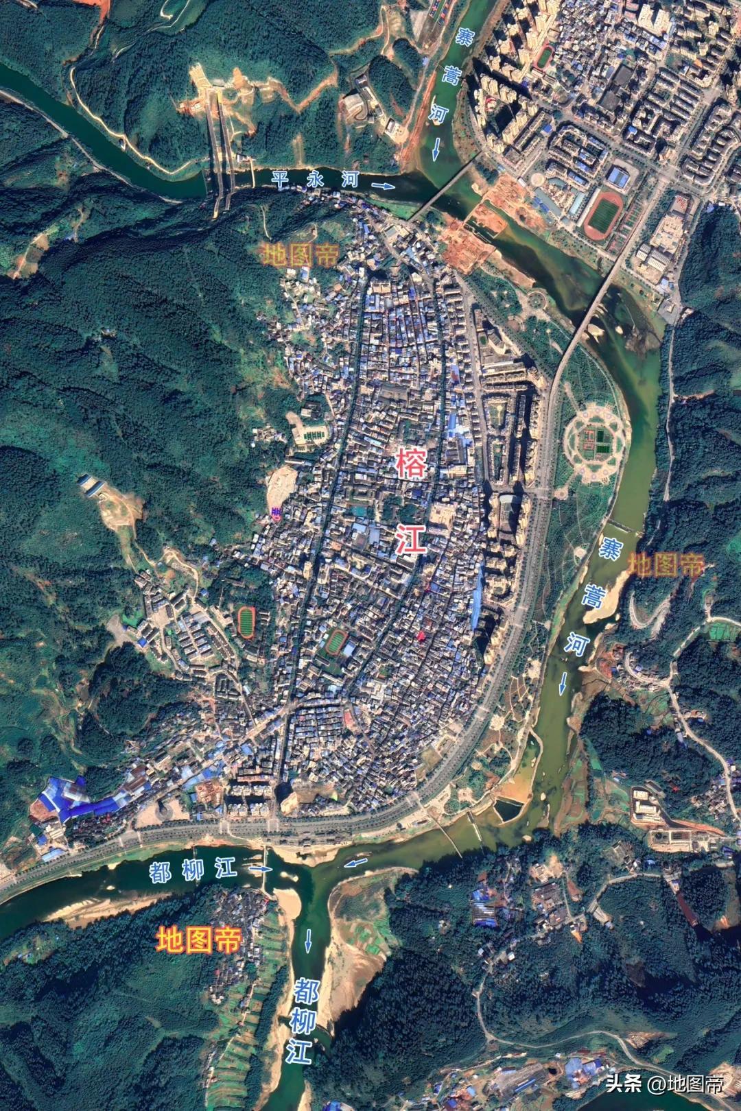 榕江地跨珠江和長江流域,80%在珠江流域,縣城在都柳江、寨蒿河、平永河三江交匯處,都柳江的水最終流入珠江口,路徑是:都柳江-融江-柳江-黔江-潯江-西江-珠江口。