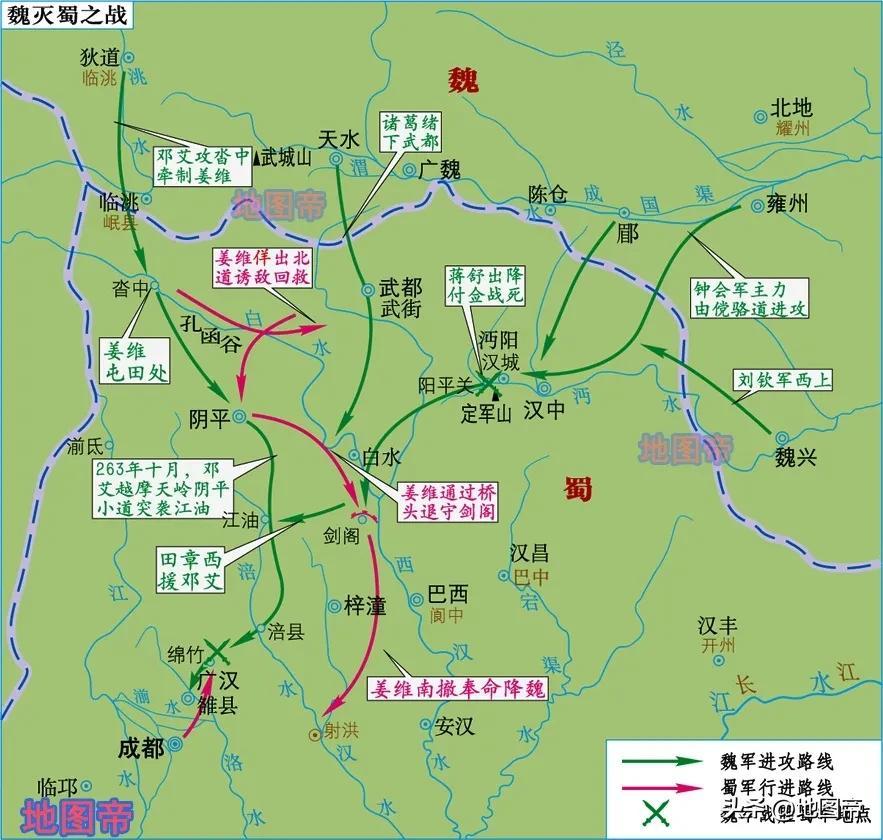263年(曹魏元帝景元四年;蜀漢懷帝景耀六年或炎興元年)八月,司馬昭兵分三路,徵西將軍鄧艾、中護軍諸葛緒、鎮西將軍鍾會南下,蜀漢衛將軍諸葛瞻(諸葛亮長子)陣亡,劉禪率文武百官出降,蜀漢滅亡。