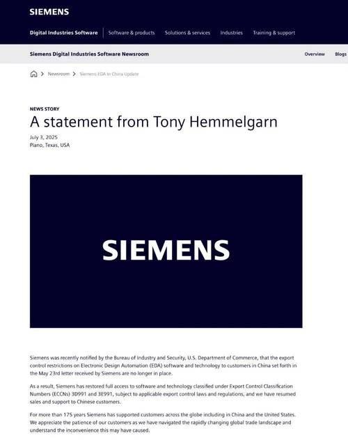 美國芯片EDA供應商:收到美政府解除對華出口限制通知,正恢復對華供應.環球時報.2025-07-03