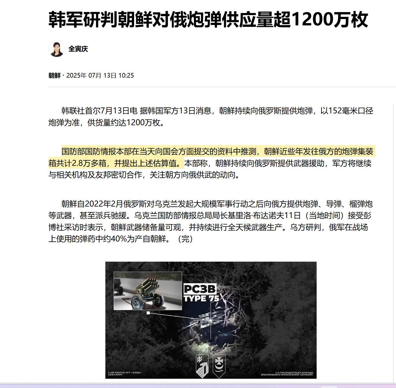在戰爭中,朝鮮幾乎成了俄羅斯的後勤基地,據韓國軍方13日消息,朝鮮持續向俄羅斯提供炮彈,以152毫米口徑炮彈爲準,供貨量約達1200萬枚。國防部國防情報本部在當天向國會方面提交的資料中推測,朝鮮近些年發往俄方的炮彈集裝箱共計2.8萬多箱,並提出上述估算值。
