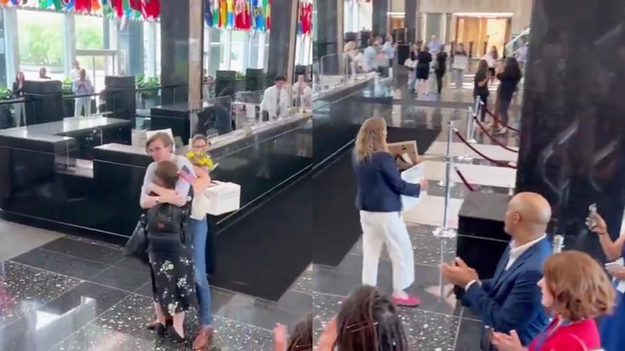 但這“勝利”的代價,是1350人丟了飯碗,還沒來得及道別。多名同事當天在大樓外集會,舉着“感謝外交官”與“我們值得更好的待遇”的標語,現場一度情緒激烈。