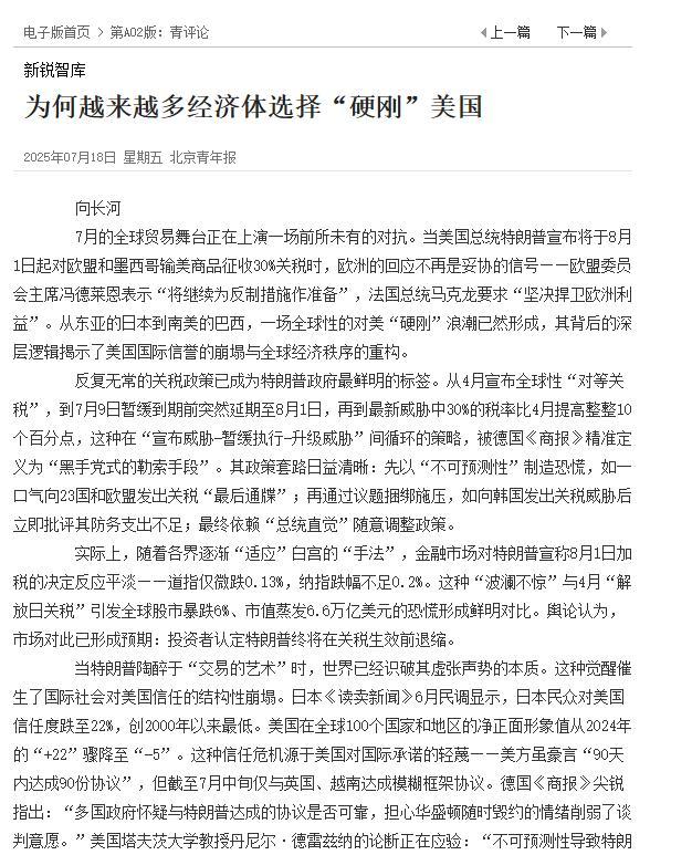 爲何越來越多經濟體選擇“硬剛”美國,北京青年報,2025年07月18日