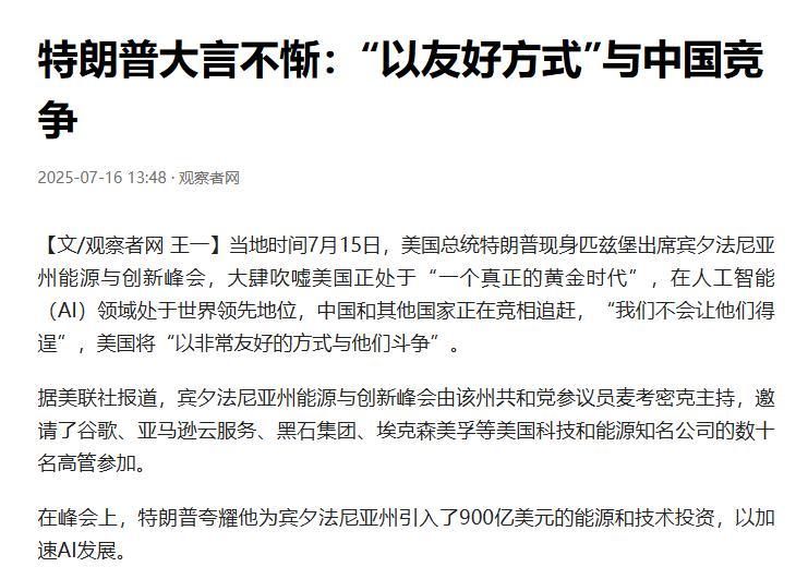 2025年7月15日,特朗普剛在賓州“能源與創新峯會”上假惺惺地表態,說要和中國搞“非常友好的競爭”。