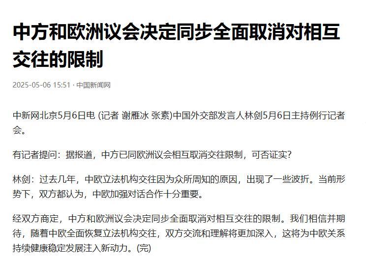 中方和歐洲議會決定同步全面取消對相互交往的限制,中國新聞網,2025年07月16日