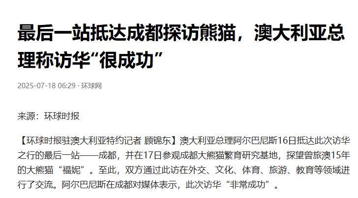 最後一站抵達成都探訪熊貓,澳大利亞總理稱訪華“很成功”,環球網,2025年07月18日