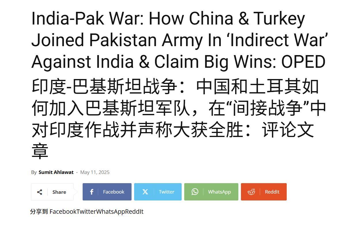 印度朝野大發雷霆,竟將責任全都歸結在中國以及土耳其身上。印度媒體《歐亞時報》曾刊發一篇題爲《中國和土耳其如何加入巴基斯坦軍隊,在“間接戰爭”中對印度作戰並聲稱大獲全勝》的文章,直指兩國通過提供武器支持和參與信息戰,爲巴基斯坦的宣傳提供了全球影響力。