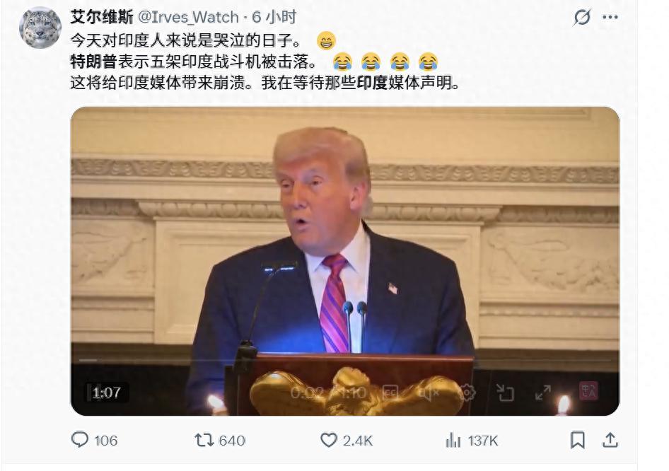 其中,特朗普所說的“我認爲有五架戰鬥機被擊落”,特別讓印度人破防。這是因爲在5月7日的空戰中,巴基斯坦宣稱自己擊落了印度五架噴氣式戰鬥機以及一架無人機。在五架被擊落的戰機中,包括3架陣風、1架蘇30和一架米格29。