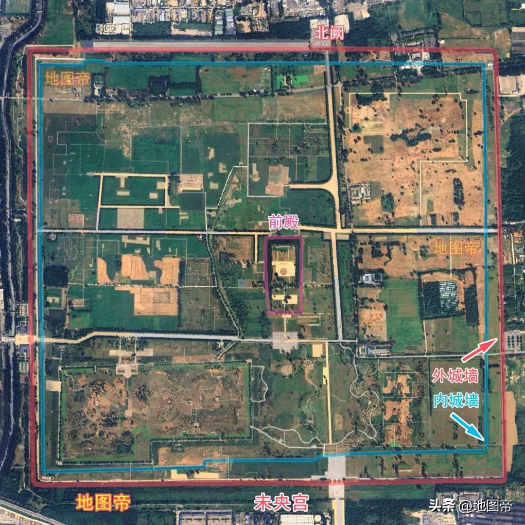 未央宮是皇帝的正式皇宮,椒房殿是皇后住所。未央宮呈長方形,邊長爲2150米-2250米,周長8800米,面積約5平方千米,是明清紫禁城的七倍。