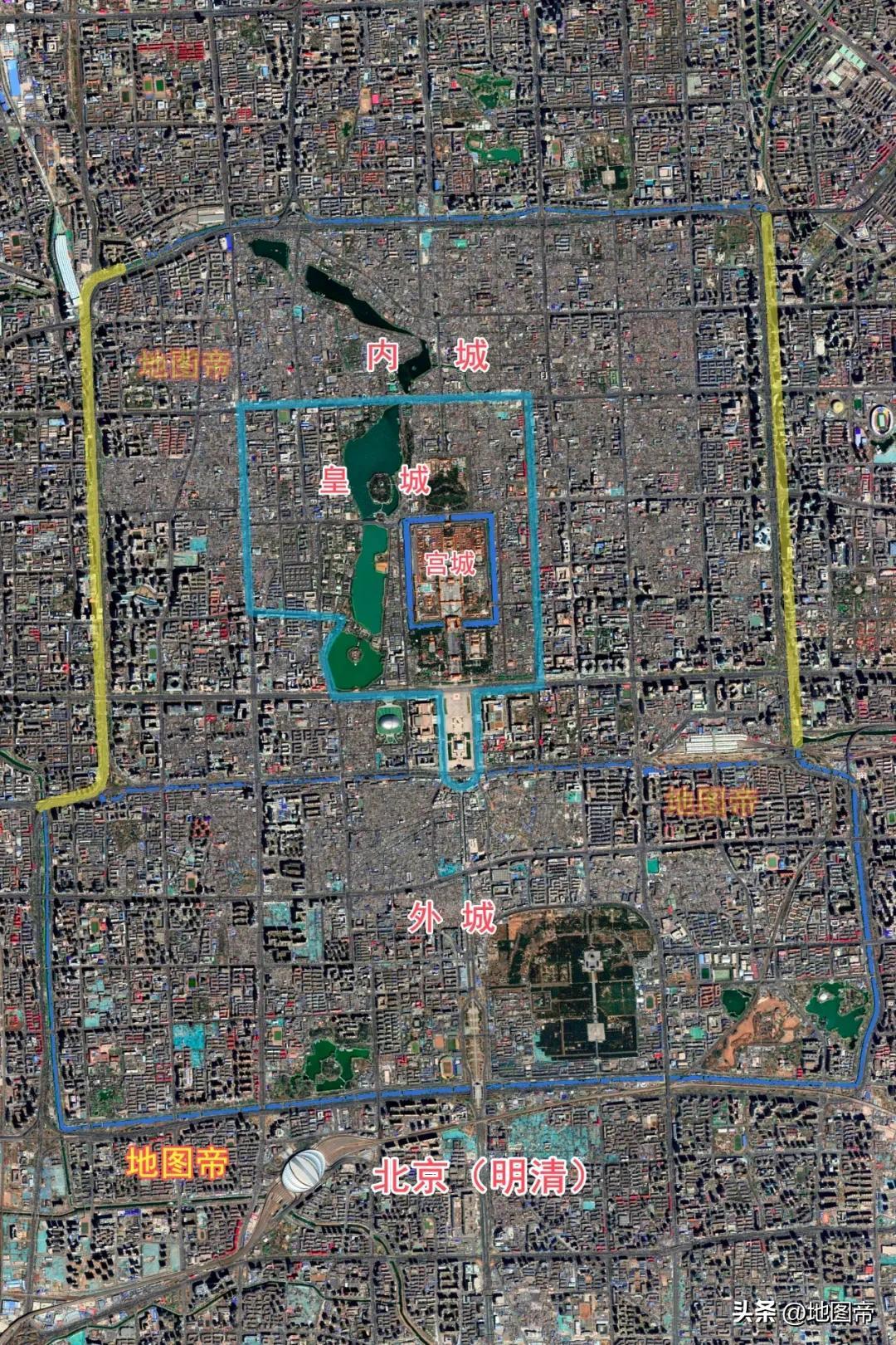 明清北京城呈“凸”字型,南邊是外城(國城),北邊是內城(京城),內外城面積合計59.43平方千米。內城裏面有皇城,皇城裏面有宮城(紫禁城)。外城面積23.85平方千米,內城面積35.58平方千米。