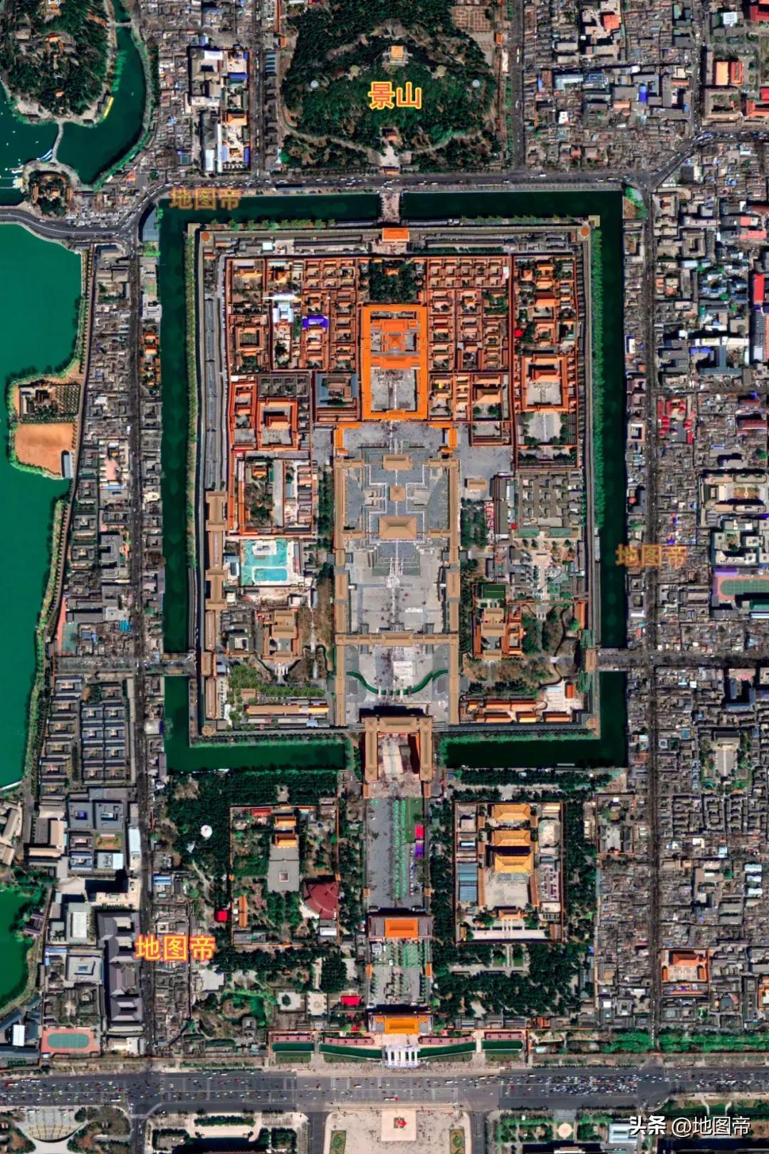 皇城呈缺西南角的矩形,周長10.7千米,面積約7平方千米。故宮呈矩形,周長約3.4千米,面積72萬平方米(0.72平方千米)。