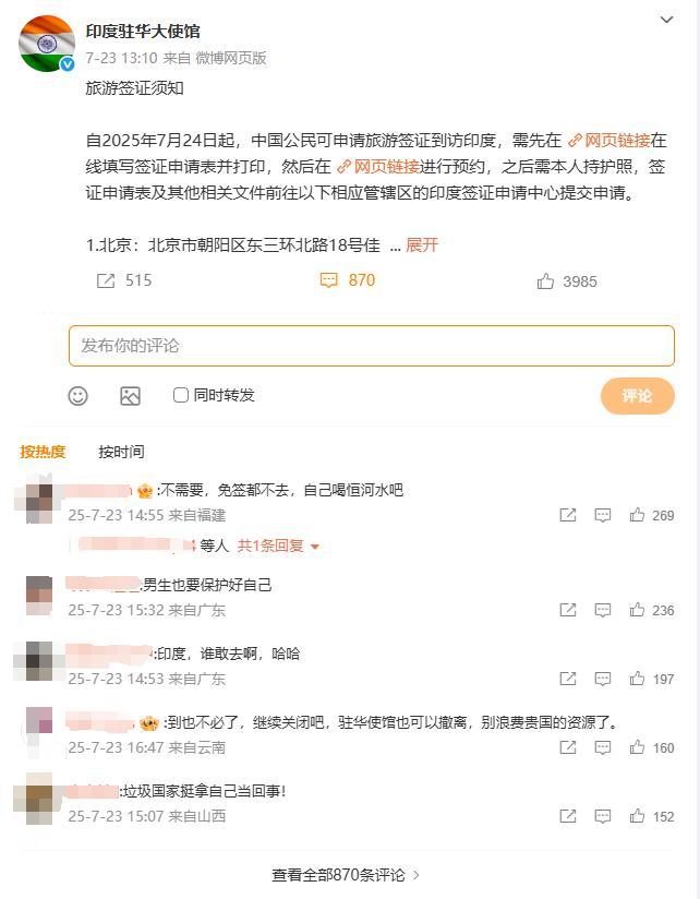 更可笑的是,截止到本文發佈前,印度駐華大使館官方微博關於旅遊簽證須知的消息,獲得了870條留言,絕多大數網友評論表示“免籤都不去”,甚至還有人批評印度“太把自己當回事”。