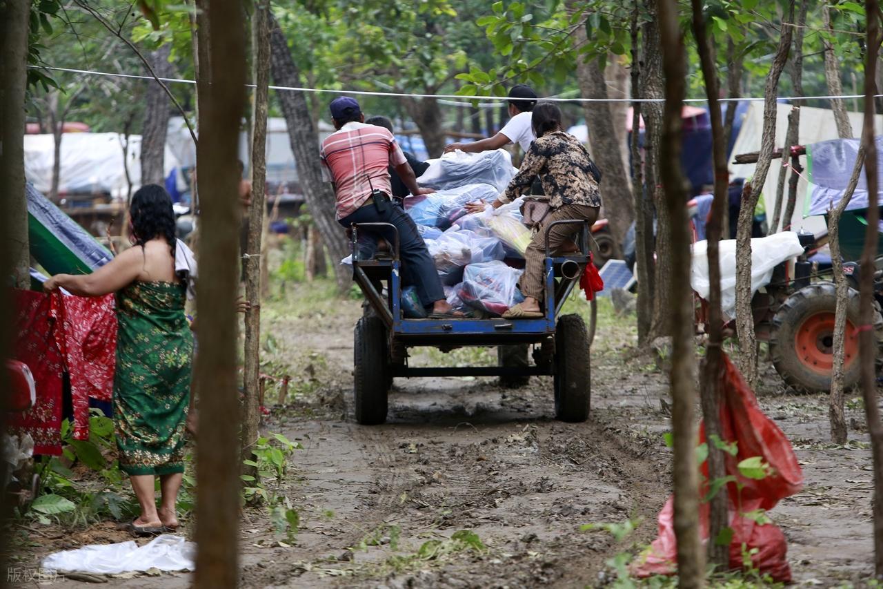 圖| 當地時間2025年7月27日,柬埔寨奧多棉吉省,泰柬連續第四天交火,流離失所者進入臨時避難營地休整
