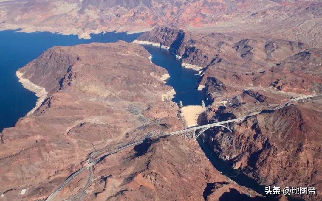 洶湧湍急、奔騰咆哮的科羅拉多河,被胡佛水壩攔截。胡佛水壩下游彷彿一條藍色的巨龍,蜿蜒盤臥、蔚爲壯觀。
