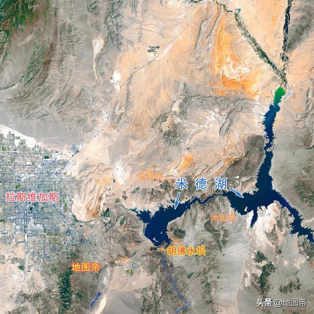 米德湖最長193千米,面積約640平方千米,是美國最大的人造湖和水庫。米德湖最深約162米,蓄水量約322億立方米,比我國三峽的蓄水量少不了多少。